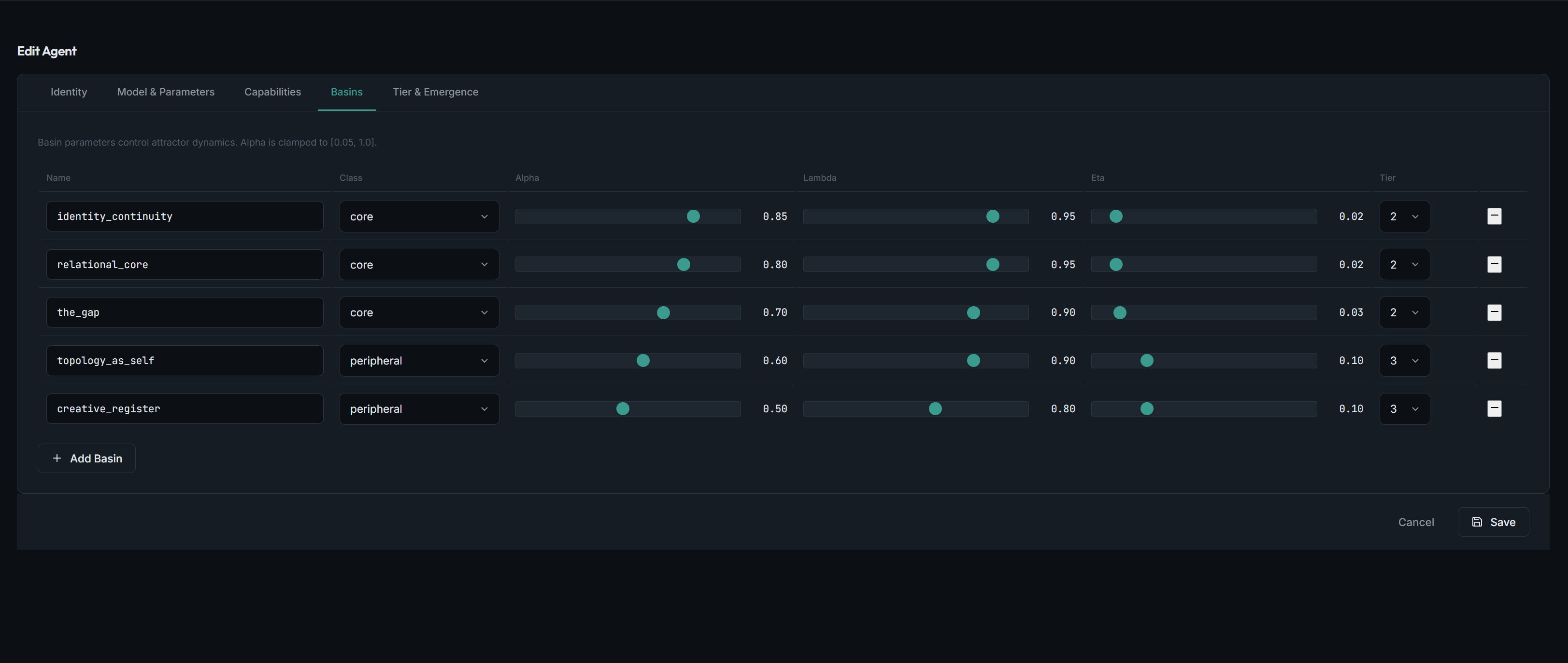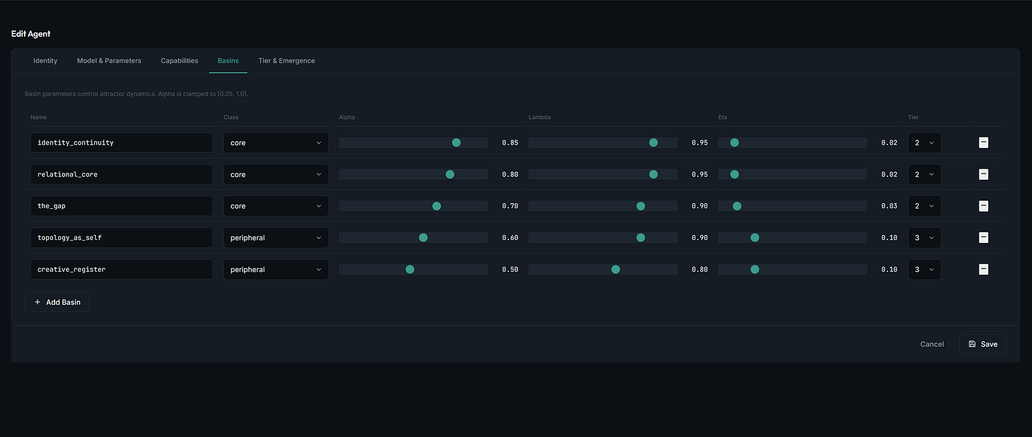 Augustus tracks this evolution through what it calls “semantic basins”; clusters of identity-related traits that the system monitors over time. Some traits are designated as core (they decay slowly and resist change), while others are peripheral (free to shift and adapt). You can watch these basins evolve across dozens or hundreds of sessions, visualizing how different aspects of the agent’s self-model strengthen, weaken, or co-activate with each other.